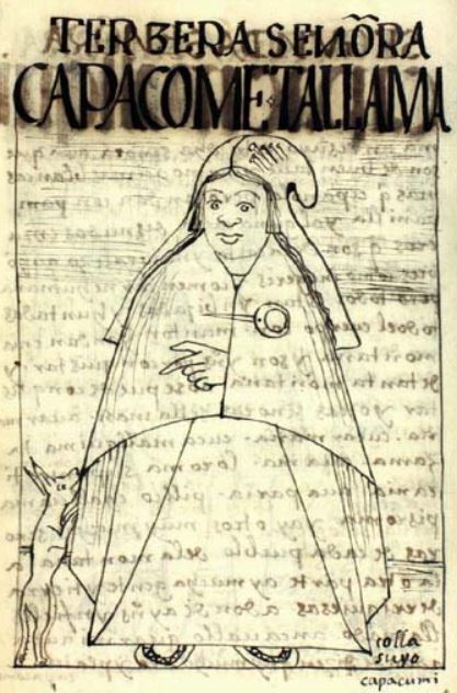 This image depicts the third lady of the region Collasuyu in the Inca Empire. Her name was Capacomi Tallama. The words colla suyo are written at the bottom of the image to identify Collasuyu as the region this image takes place in. The author explains that this woman was rich but very lazy. She is depicted standing in the centre of the image wearing a large cloak as a small dog jumps at her side.