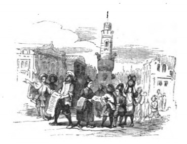 Here we see a Lilliputian royal official reading Gulliver’s sentence of blinding via arrows publicly. This was common practice and was meant to show the leniency of the Emperor who spared Gulliver from death when he was faced with charges of treason. This can be read as an allusion to the Parliamentary Proclamation of 1715 praising George I of England’s mercy regarding the Jacobite's following a revolt – some of the rebels were executed despite this proclamation of mercy. In this image we see an official reading from a scroll with his mouth open. He is accompanied by another official and a woman who hands out copies of the proclamation to the crowd. This proclamation would have outlined the charges against Gulliver as well as his punishment. This scene takes place in the centre of the city and we can see a fountain behind the crowd and several other buildings. The same image appears in the 1843 Krabbe edition.