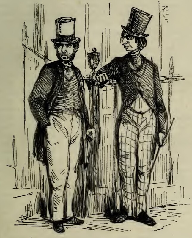 - Two assistants of Mr. Moses, the sheriff’s-officer, watching the Crawley’s residence on Chancery Lane. They are wearing black coats and tall hats, carrying thin sticks, and scowling.