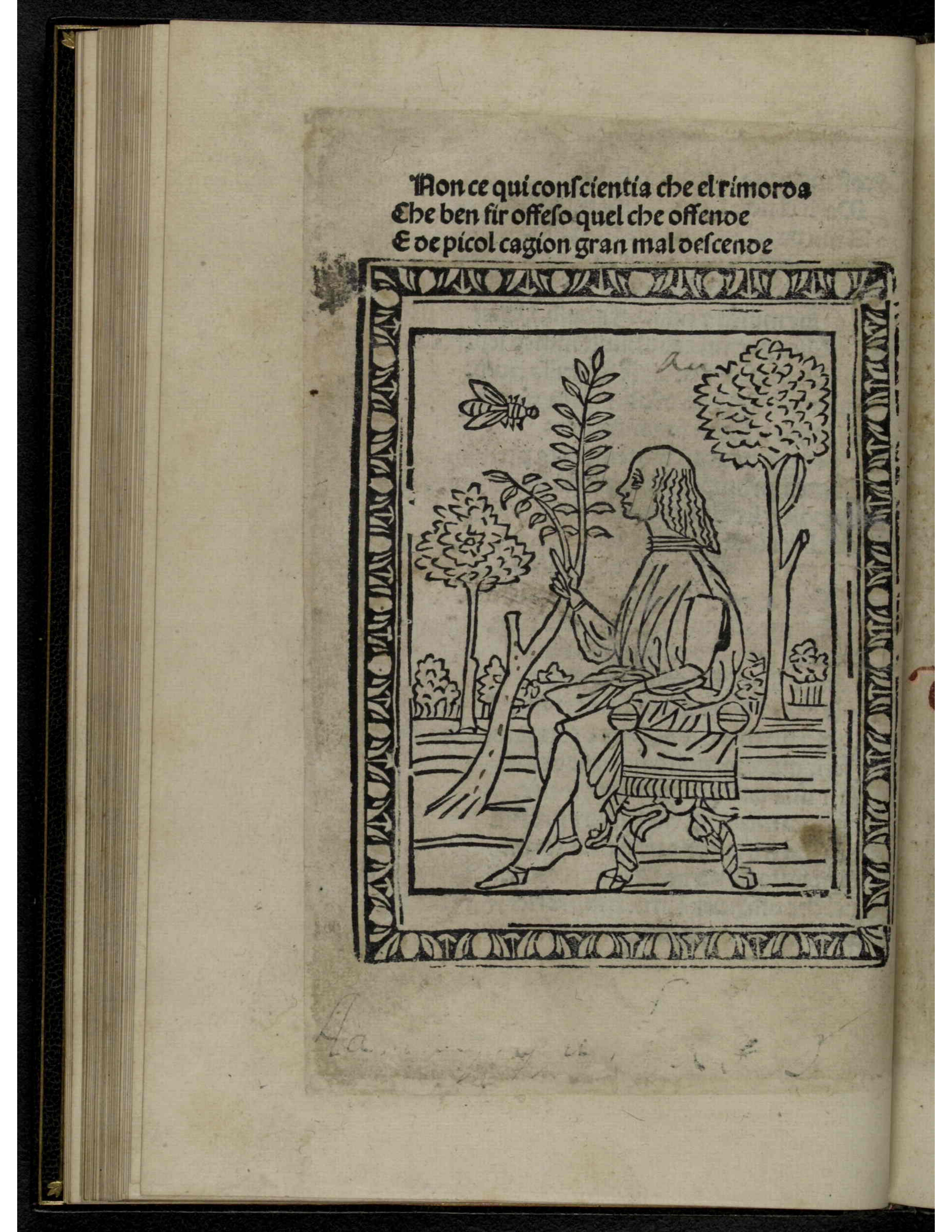 In the middle of a field, a man is sitting on an decorated chair. He’s got his right hand in the air, with one finger sticking out. The man looks tired. The top of his head is bald, with curly hair flowing to his shoulders starting slightly at the top of his ears. Tree’s and bushes are in the background. Above the head of the man, to the left of the image, a bee flies in the sky.