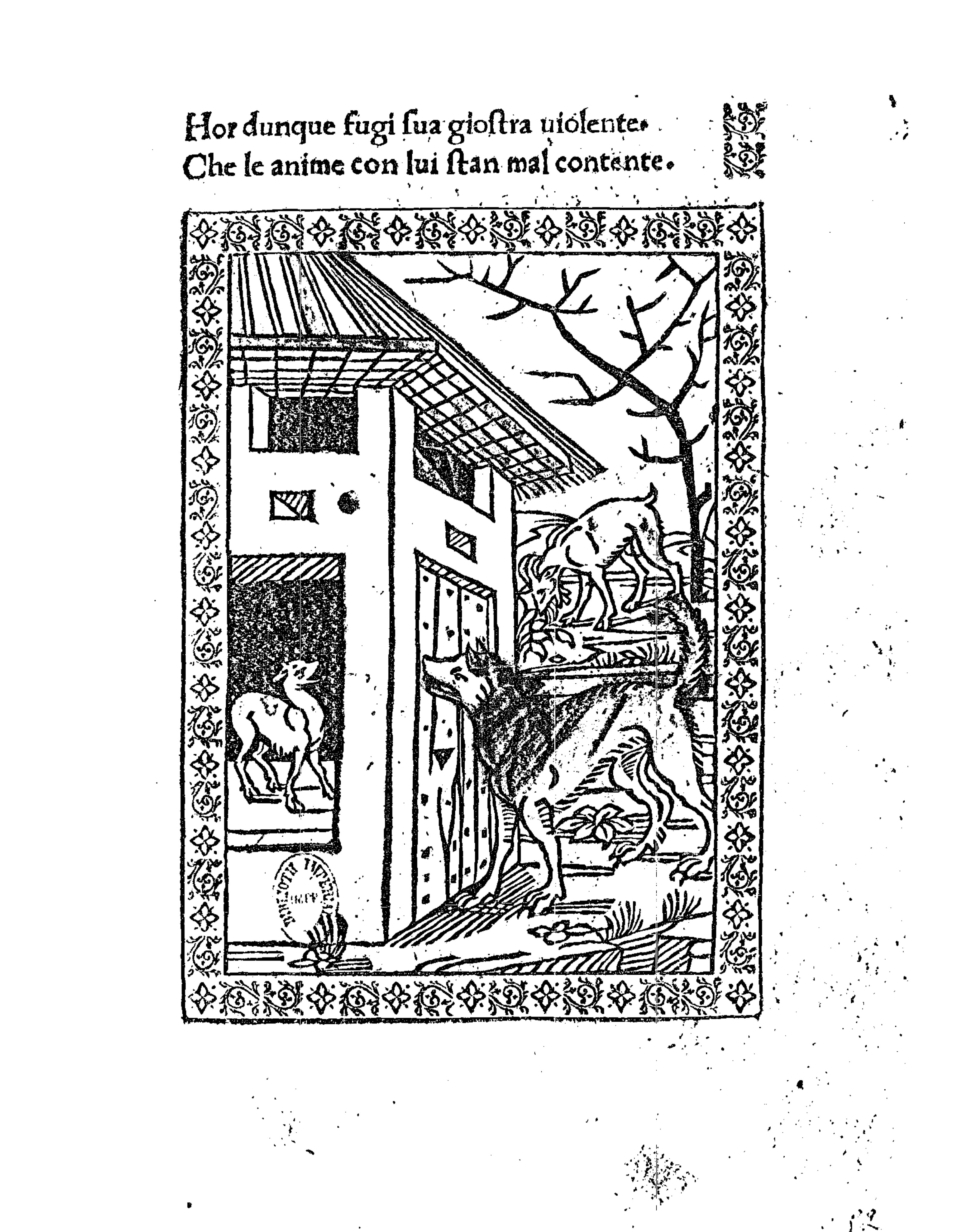 A wolf is standing at a closed door to a house, through the window you can see there is a small baby goat looking terrified. Another goat which may be the mother grazes in the backround underneath a dead tree. The image is bordered by a vine design and the signature of Liberale de Verona is stamped on the bottom left.