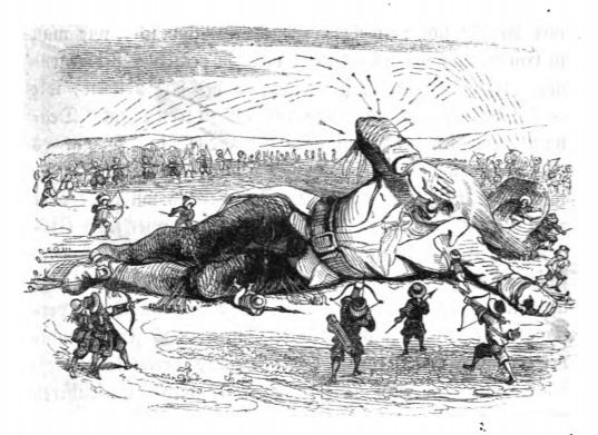 In this image we see Gulliver who has freed his left arm from the Lilliputian’s ties, attempting to stop the arrows of the Lilliputians. He is surrounded on all sides by the Lilliputians who are firing arrows at him. We see the shower of arrows in the air going towards Gulliver’s arm which is defending his face. Gulliver’s right hand and legs remain tied up. Gulliver’s hat lies behind his head, with a Lilliputian hiding behind it. The same image appears in the 1839 Krabbe edition.