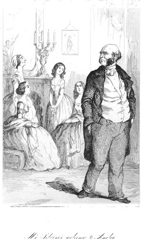 Jane and Maria Osborne are seated on two low chairs in front of the fireplace in their drawing-room. Upon it are a very large mirror, a statue of a warrior, and a candelabra; to the side of the mirror hangs a small portrait. Amelia Sedley is standing between the sisters, looking uncomfortable and holding her hands clasped together. Miss Wirt is standing opposite Amelia, looking haughty. In the foreground of the image is Mr. Osborne, mostly turned away from the others as he walks off with a scowl on his face. Below the illustration is printed in cursive its title, Mr. Osborne’s welcome to Amelia.