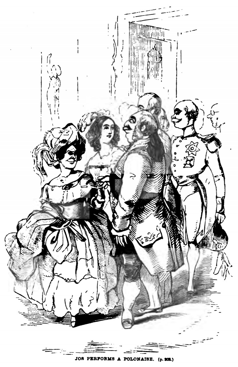 Joseph Sedley stands opposite the Countess of Schlüsselback, holding her hand as they walk a Polonaise at a Court-ball. Behind them in the row are Major Dobbin and Amelia Osborne, with another decorated officer in the pair after. Below the illustration is printed its title and location in the story, JOS PERFORMS A POLONAISE. (p. 303.).