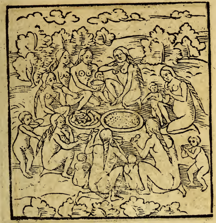 A group of Tupinambá women and children sit on the ground in a circle sharing food. In the middle of the circle there are two large dishes on the ground, one of which appears to hold human innards. The women and children fill individual bowls from the large dishes to eat from.