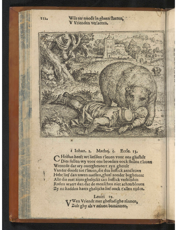 The bear and the two friends'; a bear at right stands next to a sleeping man; the bear is sniffing him; in the background a second man is hidden in a tree; Dutch letterpress on verso; illustration to Eduwaert de Dene's edition of Aesop's Fables, De Warachtighe Fabulen der Dieren (Pieter de Clerck, Bruges: 1567). c.1567Etching