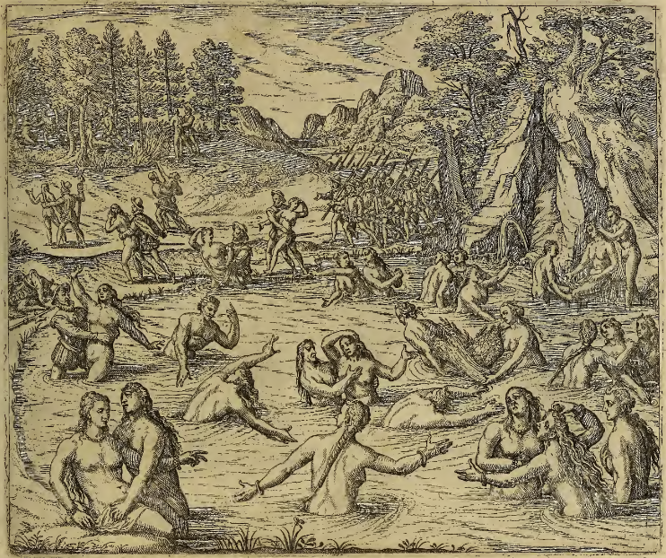 After the Inca Emperor Atahualpa (Atabalipa) was captured by Francisco Pizarro and his men, Spanish soldiers rampaged through the area around Cajamarca in Peru. Here, a group of soldiers have come across a pond where several Inca women bathe. Some of the Spaniards approach the pond from the far side, and others wade into the water and seize women. Several of the women have been pulled from the water and are dragged by the soldiers towards a stand of trees nearby. Women amongst the trees are pushed to the ground by soldiers, and sexually assaulted. This image is identical to one found on page 8 (125) of Frankfurt, 1597.