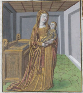 This illustration depicts Libya, the daughter of King Epaphus of Egypt, holding and looking at her son, Busiris. She is illustrated wearing a brown/yellow dress which flows onto the ground. Boccaccio explains that he briefly wrote on Libya as her accomplishments must have been great due to the country of Libya being named after her.