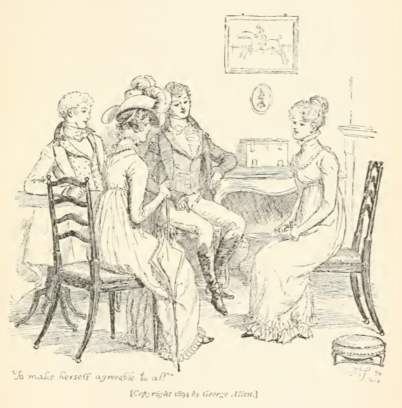In this image Elizabeth entertains Mr. Darcy, Georgiana, and Mr. Bingley at Lambton. The three were staying at Pemberley while Elizabeth was visiting Derbyshire with her aunt and uncle. After visiting Pemberley, Mr. Gardiner invited Mr. Darcy to come pay a visit to Lambton, where they were staying in Derbyshire. Mr. Darcy happily accepted, and brought his sister, Georgiana, and Mr. Bingley. This scene occurs in chapter 44. The characters are shown in the traditional regency style. Georgiana and Elizabeth wear dresses with empire waistlines. Georgiana wears a bonnet and holds a parasol. Mr. Darcy and Mr. Bingley wear waistcoats and tailcoats with cravats. The regency period dated to the early nineteenth century (1811-1820) when George, Prince of Wales, later George IV (r. 1820-1830), reigned as regent for his mentally ill father, King George III (r. 1760-1820). The regency period is associated with the rise of neoclassicism in art and fashion.