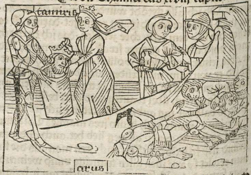 This engraving depicts Thamyris, queen of Scythia, placing the decapitated head of king Cyrus into a bag. Thamyris’ name is engraved beside her head, and Cyrus’ name is engraved beside his body at the bottom of the image. Boccaccio explains that Cyrus had invaded Scythia looking for glory, and when he had killed Thamyris’ son, she exacted her revenge by killing his entire army. When Thamyris found Cyrus’ dead body, she took his head. There are other dead bodies among Cyrus which are his men. There are Thamyris’ soldiers surrounding her, and one who is helping her put the head of Cyrus into the bag.