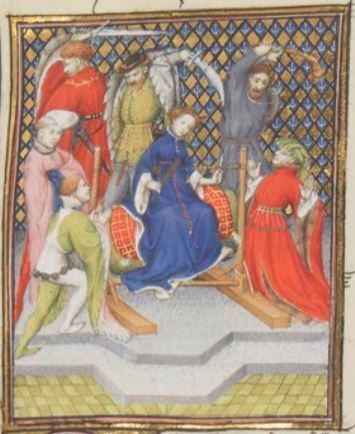 This image depicts Penelope, the wife of Ulysses, weaving in the centre of the image as she waits for her husband to return from the Trojan War. Penelope had many suitors over the 20 years that she waited for Ulysses to return home; however, Boccaccio explains in his story that Penelope remained entirely faithful over the duration of his absence. Penelope told the suitors that she would continue to wait for her husband to return until she was done weaving a cloth, which is why she is depicted weaving in this image. Each night, she would undo all the weaving she had done that day so she could continue waiting for Ulysses. There are suitors in front of Penelope kneeling as they try to impress her. When Ulysses finally returned home, he had slain every suitor in his palace. Ulysses and two of his servants are depicted standing behind Penelope as they swing their swords to kill Penelope’s suitors.