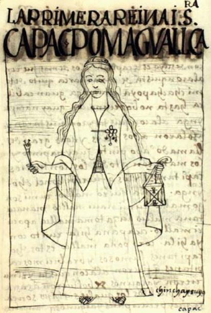 This illustration depicts the first lady of the region of Cinchaysuyu in the Inca Empire. Her name was Capac Huarmi Poma Hualca (also spelled Capac Warmi Poma Wallca). The author explains that this woman was beautiful and governed her region well. She was the wife of Apo Guaman Chaua, second in command of the Inca. She is depicted standing in the centre of the image with what appears to be a flower in her right hand and a small bag in her left.