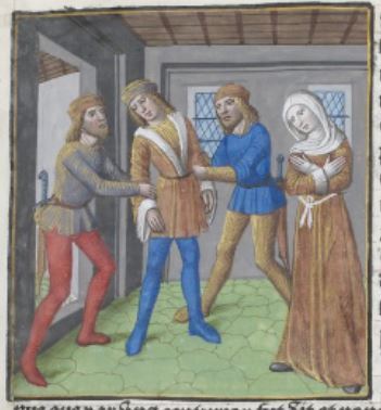 This image depicts Pompeia Paulina standing on the right side of the image and her husband Lucius Annaeus Seneca standing on the left side of the image being taken by centurion guards. When Emperor Nero ordered that Seneca was to be put to death, Pompeia Paulina wanted to die with him. Seneca was put into a tub and had his arms cut to bleed out, and Pompeia Paulina got into a tub with him and cut her arms as well. She survived the suicide attempt by slaves who intervened to save her. Boccaccio explains that he wrote on her to praise her devotion to her husband despite the failed suicide attempt.