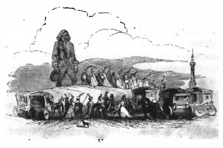 In this image we see Gulliver’s arrival in Blefuscu. Gulliver waded across the water between Lilliput and Blefuscu and here we see him coming out of the water onto the land. He was met by a crowd of people, including members of the Royal Family of Blefuscu. In the image we see the crowd and several carriages. In the distance we also see a tower. Gulliver’s escape to Blefuscu is often linked to Henry Bolingbroke’s escape to France in 1715 after being charged during the Jacobite rebellion. The same image appears in the 1843 Krabbe edition.