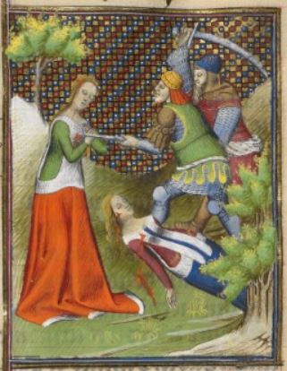 This illumination depicts a young servant girl, disguised as the noble Harmonia, lying on the ground after getting stabbed to death by the men who are standing above her. Boccaccio explains that there was a rebellion in Syracuse against nobility, and because Harmonia was the niece of the king, she was in danger. Harmonia’s nurse disguised a servant girl to look exactly like Harmonia so that when the rebels came, the real Harmonia would be safe. This illumination depicts the servant girl who died in Harmonia’s place. After seeing the bravery and selflessness of the servant girl, Harmonia willingly called out to the rebels and died in honour of the girl for dying in her place. Harmonia is depicted standing on the left side of the image getting stabbed in her chest by the same men who killed the servant.