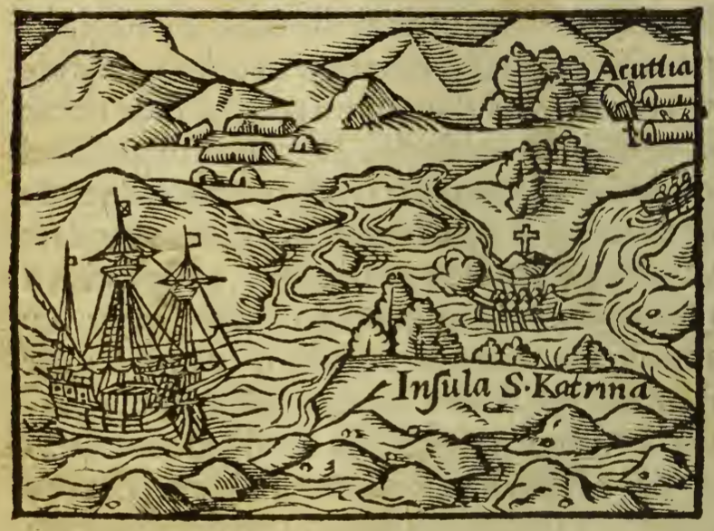 A large European ship sails near the coast of Brazil, close to an island labelled Insula S. Katrina. There are two Indigenous settlements along the coast, both comprised of several long structures. On the tip of a peninsula between the two settlements there is a large cross. Two small rowboats full of people are near the peninsula.