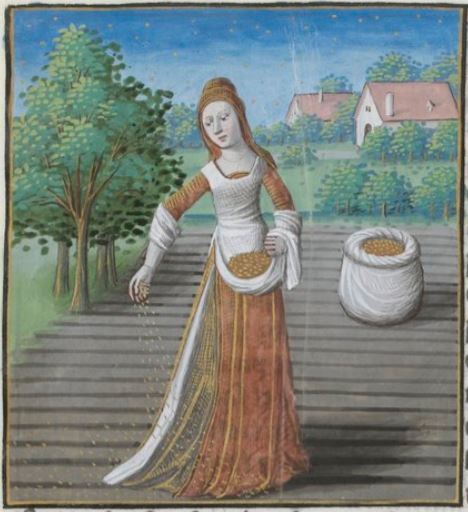 This illustration depicts Ceres, goddess of the harvest, discovering agriculture as she sows seeds into the furrows of the ground. She is carrying the seeds in her apron and holding them up with her left hand as she spreads the seeds onto the ground with her right. The rest of her seeds are in a large white bag in the background. There are modern looking houses in the background as the illustration was made in the 15th century. Boccaccio explains that Ceres was a mortal woman before people began regarding her as the goddess of harvest and agriculture.