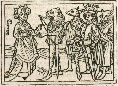 This engraving depicts Circe, the daughter of the Sun, on the left-hand side of the engraving. We know that this is Circe as her name is engraved horizontally adjacent to her body. Boccaccio explains that Circe was skilled in the art of magic and would often turn people who landed on her shores into animals. When Ulysses and his men happened upon Circe, she transformed Ulysses’ companions into beasts. They are depicted in the engraving with their bodies still in human form, while their heads are changed into animals such as lions and pigs. Ulysses is the one man among them that is still in human form (his name is engraved above his head). Ulysses threatens Circe with his sword, and she eventually changes his companions back into their original forms.