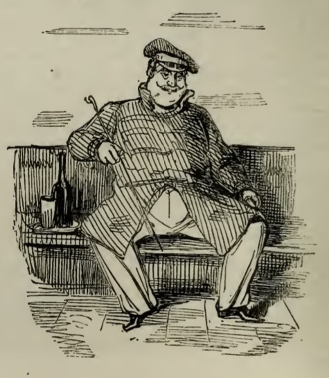 - Joseph Sedley sits on the roof of the cabin on the boat to Belgium. Beside him on the bench are a cup and bottle of beer. He looks very comfortable and relaxed.