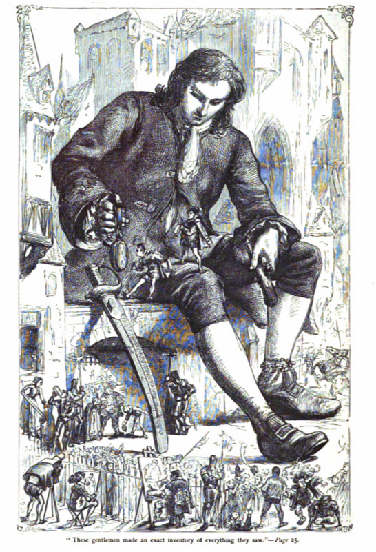 The Lilliputians took a detailed inventory of all of Gulliver’s belongings, shown here. Gulliver sits in the centre and shows the Lilliputians his things. He holds his pocket watch in his hand, and his sword is sheathed, leaning on the wall next to him. Two Lilliputians sit on Gulliver’s leg, while others are on the ground next to him.