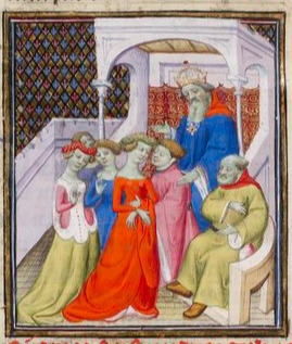 When the Emperor Otho laid eyes on Engeldruda, her beauty led him to choose her as the maiden that would be married off to a man named Illitio. She is represented standing with a group of women, with herself at the front wearing a bright red gown. The emperor is wearing a blue cloak with a crown, and Illitio is seated in the throne in a green cloak.