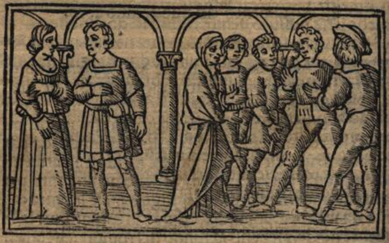 On the left side of this illustration, we see a male figure and a female figure off by themselves, the latter of which is wearing a robe. These two figures could represent the scene in which Calisto talks with Melibea (although their conversation occurs through the door to Melibea’s house). To the right, we see a female figure wearing a robe and a veil. She is interacting with a group of four male figures. This could be viewed as denoting the scene in which Sempronio and Pármeno murder Celestina. However, in that scene there are two male figures and two female figures, so this representation is not closely related to the events of Act XII. [This illustration is identical to those found in Acts I (folio 9r), VII (folio 52v), IX (folio 67r), XI (folio 80r), XIV (folio 96v), XVI (folio 106v), and XIX (folio 115v).]