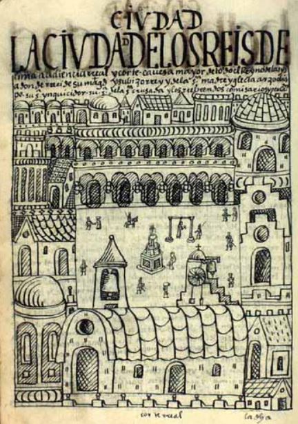 This image is depicted in the author’s chapter where he discusses cities, towns, villages, and provinces in colonial South America. This image depicts the large city of Lima in Peru. The city is arranged in a cluster of buildings which forms a square in the centre of the town. There is a fountain in the centre of the square as well as a gibbet used to hang people. There are soldiers holding spears walking in the square as well as a soldier riding a horse. There are also citizens walking around the square. The city of Lima was used as a centre for government and was changed to the capital of Peru after the Spanish conquered it. The caption at the bottom of the image reads, corte rreal [royal court].
