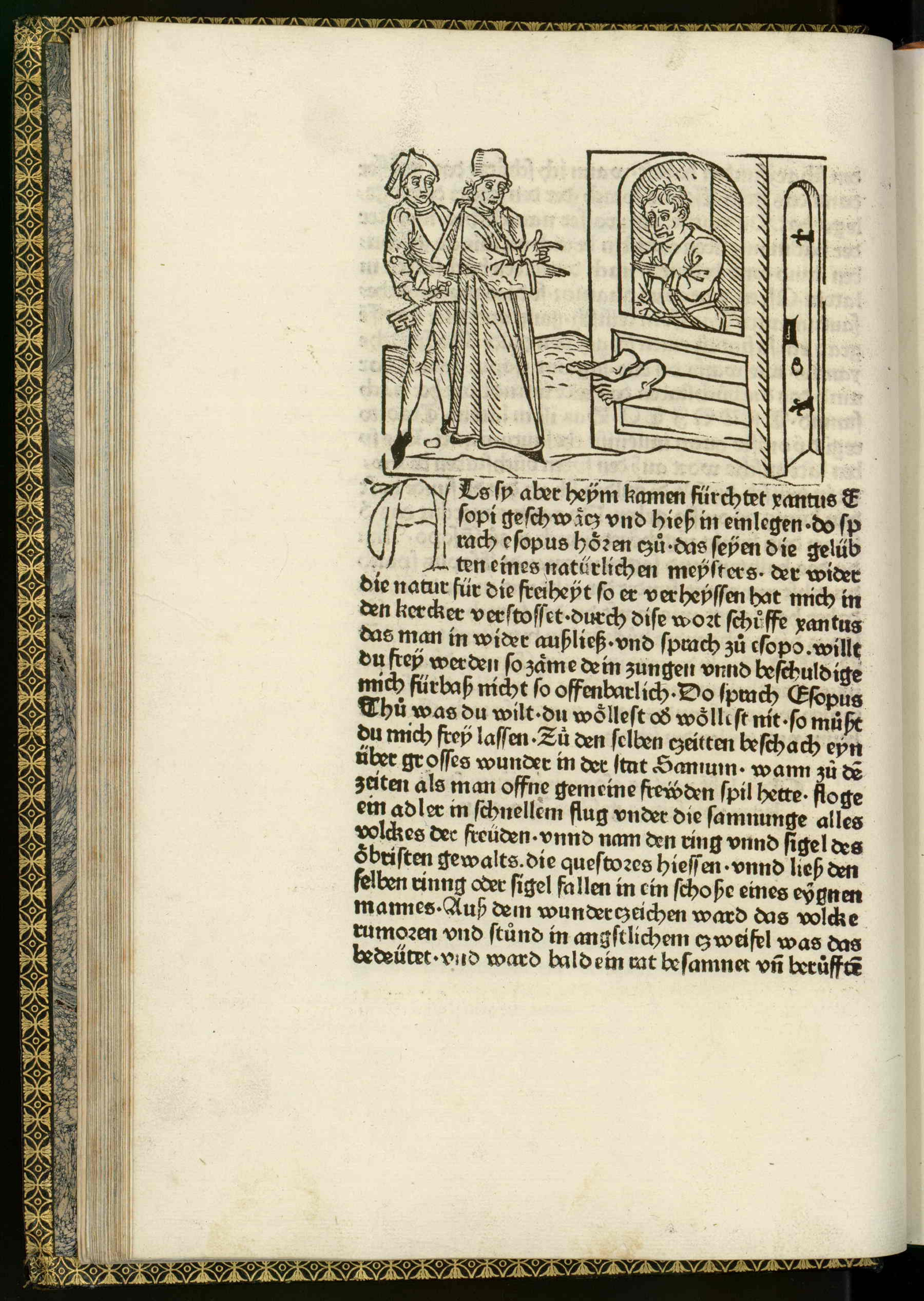 Vita et Fabulae [Two men converse with a person who is inside a small structure with only his feet sticking out]