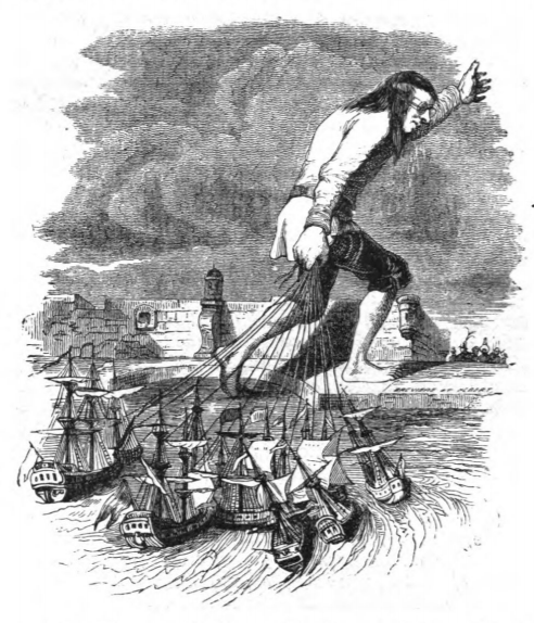 [Gulliver pulls Blefuscudian ships back to Blefuscu]