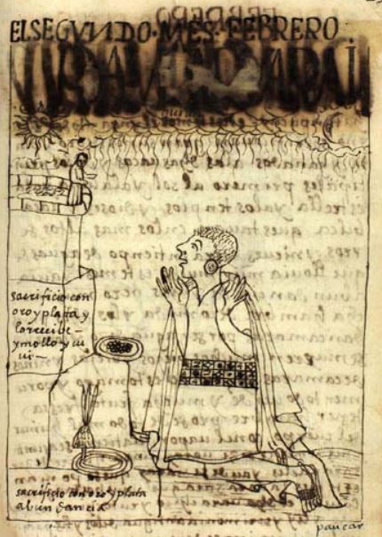 This chapter is dedicated to discussing the traditions and rituals of each month during the Inca Empire. The Incas tracked the months and years through the stars and their months consisted of thirty days. This image depicts the month of February, which was dedicated to wearing loincloths and sacrificing gold, silver, and llamas to their idols and Gods. The author explains that February was also a month of heavy rains, which is why there are clouds and rain drawn at the top of the image. There is a man kneeling in the image as he offers his sacrifice to his idol which is pictured atop a mountain on the left side of the image. The caption that describes the image is written written on the side of the mountain and it reads sacrificio con oro y plata y lo rrecibe y mollo y cuui, which translates to sacrifice of gold and silver, and he receives it, and seashell and guinea pig. The other caption at the bottom of the image reads sacrificio con oro y plata abundancia, which translates to abundance of sacrifice in gold and silver.
