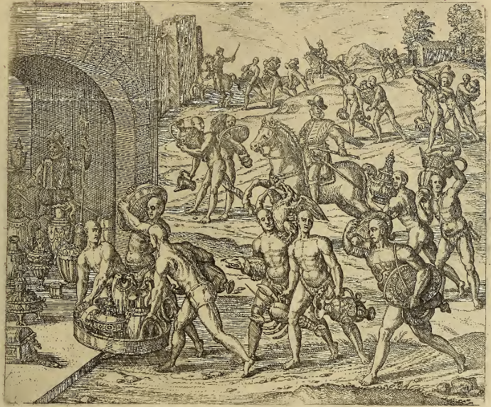 Inca Emperor Atahualpa (Atabalipa) agreed to pay the ransom amount demanded by Francisco Pizarro to secure his freedom. Inca men stream towards the walls of the city Cajamarca bearing gold and silver items, including plates, vases, chests of jewelry, carvings of mythical creatures, and other pieces they have gathered throughout Peru. The Inca people are supervised by several Spaniards on horseback wielding wooden clubs or truncheons. This image is identical to one found on page 10 (129) of Frankfurt, 1596.