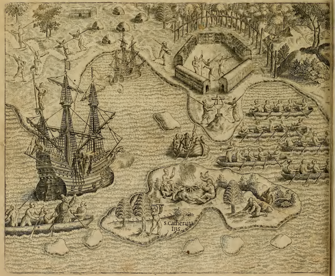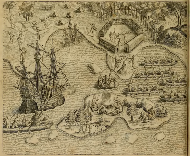 Two European ships are anchored near the coast, close to an island labelled ‘S. Catherina Ins.’ Several European men sit around a fire on the island, while others chop down a tree and gather brush. A canoe bearing several Tupinamá men and one European approaches the island from the left and five other canoes come from the right, with the five heading towards a rowboat filled with European men. On land several European men with spears explore an abandoned Tupinambá village near the shore. The frames of several of the structures are exposed and parts of the fence are broken. A large cross with a plaque hanging around it has been erected on the cape near the village and two European men stand beside it.