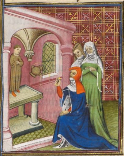 This illumination depicts a woman named Sulpicia kneeling in the centre of the image swinging a thurible at an altar. Sulpicia is renowned for having been a devoutly chaste woman. Boccaccio explains that Sulpicia was chosen out of one hundred women to consecrate a statue to Venus in the city of Rome. She was chosen for being considered the most chaste out of all the other women. The other chaste women are depicted standing behind Sulpicia.