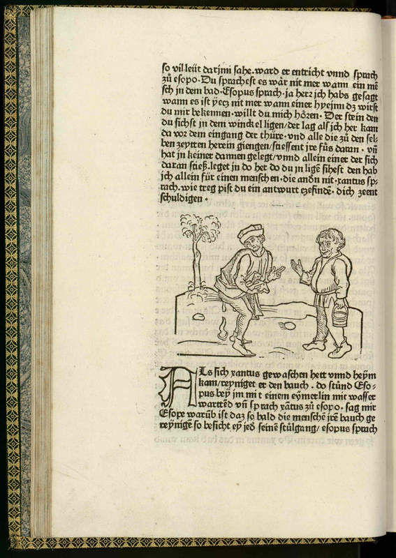 There is an illustration at the center of the page, above and below this illustration are bodies of text. In the illustration, a short man holding a small basket is talking to a man who is looking away from the short man. Whilst looking away this man is holding his robe up and seems to be excreting waste. A tree is in the background of this interaction.