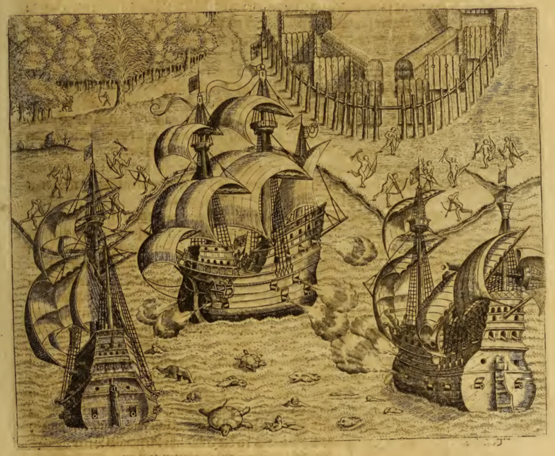 [Three European ships engage in a naval battle near the coast, where there is a Tupinambá village]