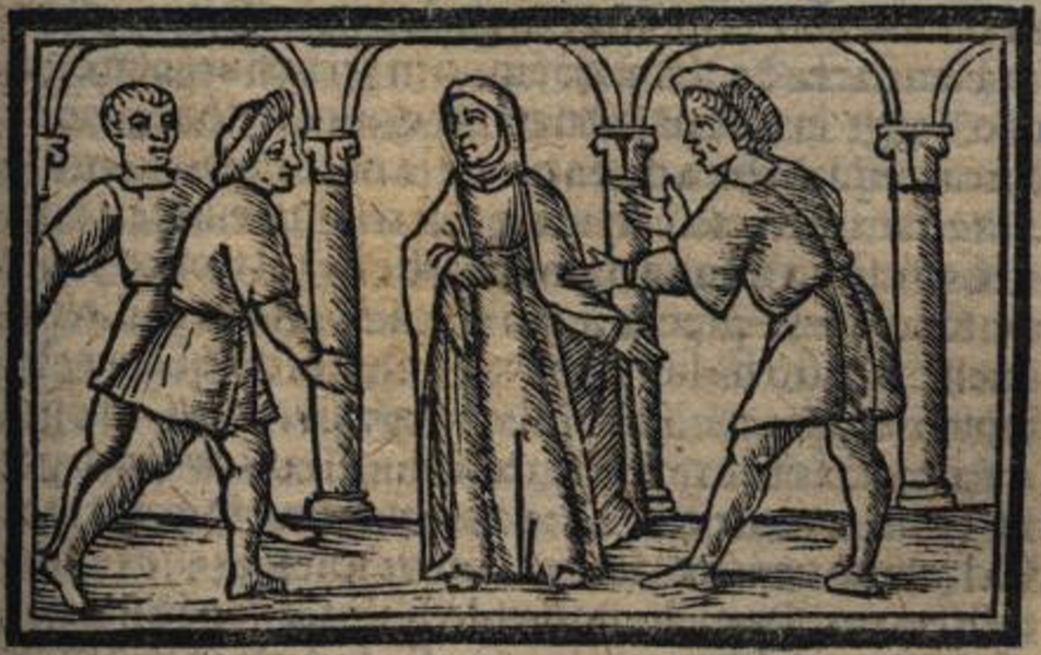 In the centre of the illustration, we see Celestina wearing a robe and a veil. There are two male figures to the left and one to the right. In Act V, Celestina and Sempronio talk to one another while travelling to Calisto’s house, and Calisto talks with Pármeno at home. It is not until Act VI that the four of them are in the same room. Thus, the scene depicted here has no relation to Act V.[This illustration is identical to those found in Acts IV (folio 32r), VI (folio 45r), VIII (folio 62r), X (folio 74r), XIII (folio 93v), XV (folio 102r), and XVII (folio 109r).]