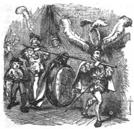 Here Lilliputians are taking an inventory of Gulliver’s personal effects. Two Lilliputians carry Gulliver’s pocket watch, linked through the top loop of the watch. The inventory was taken by the Emperor’s guards, identified by their uniform and large headwear with large feathers.