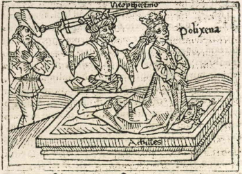 This engraving depicts Polyxena, the daughter of king Priam of Troy, getting executed on top of Achilles’ grave. Polyxena is illustrated kneeling on the grave of Achilles with her hands crossed while looking up to the sky as she accepts her fate. Her name is engraved beside her body to identify her. Achilles’ name is engraved on the side of his tomb. The man about to execute Polyxena is Neoptolemus, the son of Achilles. His name is engraved above his sword. Polyxena had lured Achilles into the temple of Apollo, where Paris shot Achilles with his arrow. Neoptolemus is the one to execute her as she is the one who is partly responsible for killing his father. Boccaccio explains that Polyxena did this through her mother’s instructions. Boccaccio explains that he wrote on Polyxena due to her fearlessness before her execution.