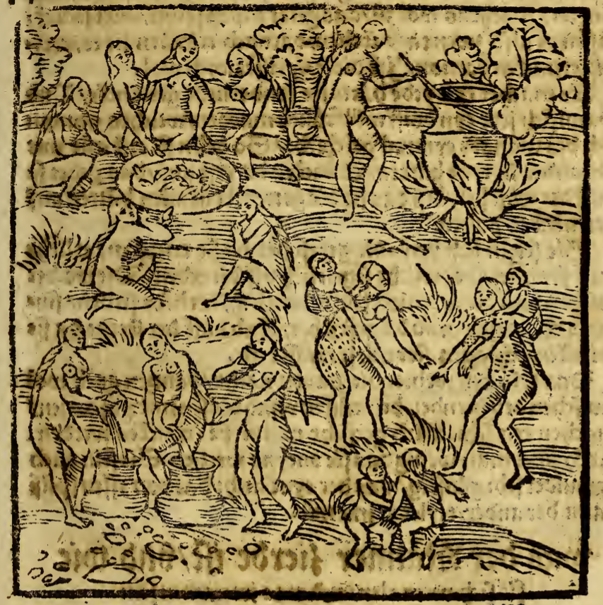 A group of Tupinambá women is shown making a traditional alcoholic beverage using cassava (manioc) root. A group of women in the left corner of the image sit in a circle and chew the roots. Another woman tends a large pot over a fire on the right. In the foreground three women strain liquid into large pots while two other women nearby carry children on their backs.