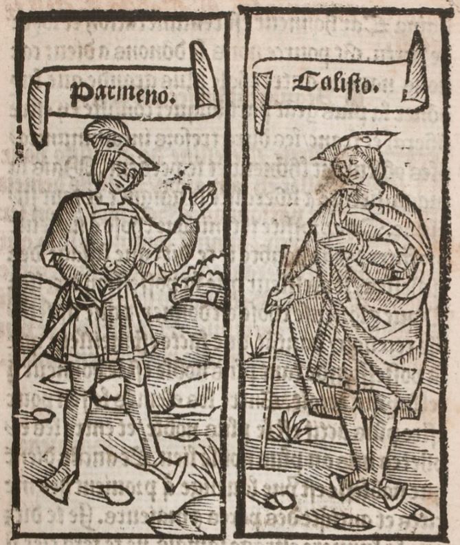 The left panel depicts Calisto’s servant Pármeno, who is wearing a hat and has a sword mounted on his belt. To the right we see Calisto wearing a hat and holding a long item of some sort, perhaps a cane or walking stick. Both figures are placed outside.The left panel is identical to those found on pages 146, 173, and 187, and nearly identical to those found on pages 263 (where it is labeled ‘Sosia’), 299 (labeled ‘Pleberio’), and 326 (labeled ‘Sosia’). The right panel is identical to those found on pages 12, 122, 225, and 235, and nearly identical to the one found on page 317 (where it is labeled ‘Centurio’).