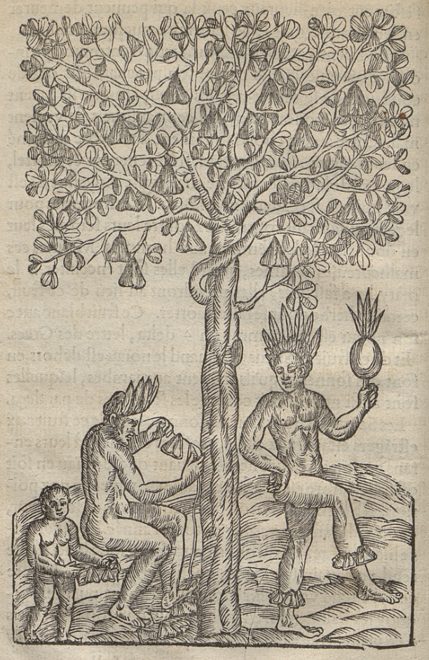 Two Indigenous men and a child stand around a tree. The man on the left crouches as he threads the items harvested from the tree (dried fruit or nuts) onto a string to make a leg rattle, like those worn by the man on the right. The man on the right dances with one hand on his hip, wearing leg rattles and holding a maraca or religious item in the other hand. Both men wear feathered headdresses. This image is identical to one found in Paris, 1557.