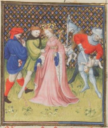 This illumination depicts Queen Athaliah of Jerusalem in the centre of the image wearing a pink dress and a crown to symbolize her royal status. There are two guards on the right side of the illustration holding children as they stab them with knives. In order to gain complete control of her kingdom, Athaliah ordered her guards to kill all the descendants of David so that none could rise and take her throne. Unbeknownst to Athlaliah, a grandchild named Jehoash had escaped her wrath and grew up to overthrow her. There are people depicted grabbing Athaliah’s arm as they take her away and kill her for her crimes.