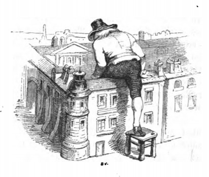 In this image we see Gulliver climbing over the walls of the Emperor’s palace, which lies in the centre of Mildendo. The walls were five feet high, so Gulliver built himself two stools out of wood to help him get over the walls – as the gates were too difficult for Gulliver to get through or over. The stools were each three feet tall, and there was one on each side of the wall. Gulliver did this because the Emperor wanted to see the Imperial Palace. The same image appears in the 1839 Krabbe edition.