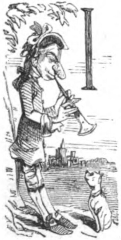 The narrator is depicted as a piper, standing beneath a tree on a hill and playing his pipe for the small dog that sits in front of him, looking up. In the distance are the silhouettes of the buildings of a town. In the top right of the image is the letter I.