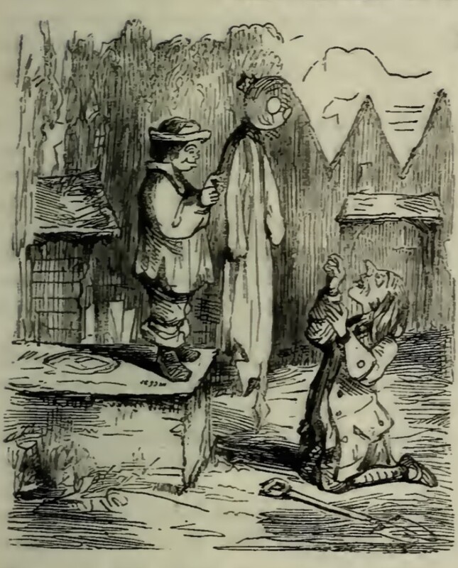 A satisfied looking boy standing on a rectangular box or platform holds in front of him a stick. On it are a turnip disguised as a head and a ragged sheet or coat, forming the semblance of a ghost. A terrified looking man is on his knees with his arms raised in front of the ghost, a shovel dropped beside him. A tall fence in the background forms the letter W from We.