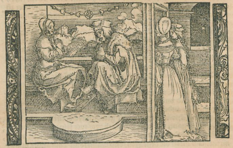 Melibea (presumably the right-central figure, since her robe appears ornate and she is wearing multiple necklaces) overhears Pleberio (left-central figure) and Alisa (leftmost figure), her parents, talking about the prospect of giving her away in marriage. They discuss the mistaken fact that she is still a virgin, and Alisa points out that she has probably never considered having a male companion. Melibea grows frustrated with their presumption that she is ignorant, and she orders Lucrecia (rightmost figure) to interrupt the conversation.