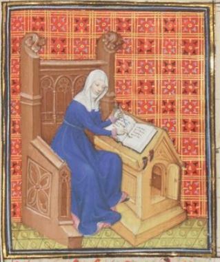 This illuminated image depicts a woman named Erythraea (also known as Eriphila) sitting down while writing a book. Erythraea was a famous sibyl and was known for predicting many major events in history. Boccaccio explains in his story of Erythraea that she predicted the fall of Troy, as well as the life and death of Jesus Christ.