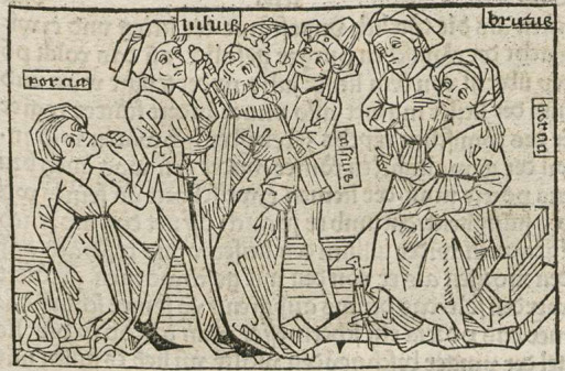 This engraving depicts three separate events. The far right of the engraving depicts a man named Brutus having a discussion with his wife Portia. We know that these figures are Brutus and Portia as Portia’s name is engraved beside her body and Brutus’ name is engraved above his head. Brutus is telling his wife the conspiracy plan to kill Julius Caesar. After hearing the conspiracy plans, Portia took a barber’s razor and cut herself with it. The engraving depicts the barber’s razor sticking out of her foot. She does this to prepare herself in case she has to kill herself should the conspiracy not work out in Brutus’ favour. The centre of the engraving depicts the assassination of Julius Caesar. Brutus is on the left side of Caesar, stabbing him in the chest. A man named Cassius is behind Caesar as he stabs his abdominal area. Their names are engraved above their heads. The far left of the engraving depicts Portia eating burning hot coals from the fire directly beside her after hearing of her husband’s death.