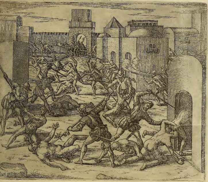 After the execution of the Inca Emperor Atahualpa, the Spaniards embarked on the long voyage to Cuzco in search of the gold Pizarro had been told was kept there. Within the walls of Cuzco, Spanish soldiers kill unarmed Inca men and women with pikes or spear, swords, and muskets. Some of the Inca people flee the Spaniards.