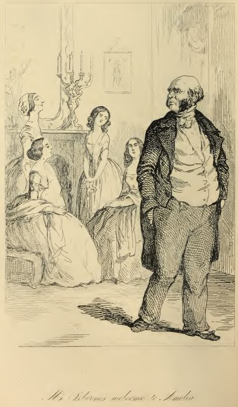 Jane and Maria Osborne are seated on two low chairs in front of the fireplace. Upon it are a very large mirror, a statue of a warrior, and a candelabra; to the side of the mirror hangs a small portrait. Amelia Sedley is standing between the sisters, looking uncomfortable and holding her hands clasped together. Miss Wirt is standing opposite Amelia, looking haughty. In the foreground of the image is Mr. Osborne, mostly turned away from the others as he walks away with a scowl on his face. Below the illustration is printed in cursive its title, Mr. Osborne’s welcome to Amelia.